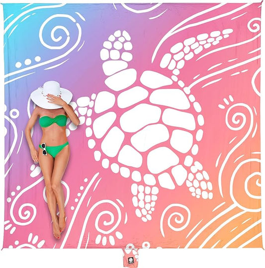 WEKAPO Beach Blanket Waterproof Sandproof Oversized Extra Large Sand Free Beach Mat with Stakes, Storage Bag - Essentials for Outdoor Beach, Picnic (Pinkish Purple Sea Turtle, 8 X 7 FT (1~4 Person))