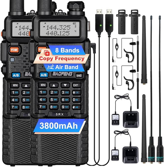 BAOFENG 5RX Ham Radio Handheld, 8-Band Receiving, Air Band, Frequency Copy, 3800mAh Rechargeable Walkie Talkies Two Way Radio with Earpiece,771 Long Range Antanna(Upgraded of UV-5R)-2Pack Full Kit