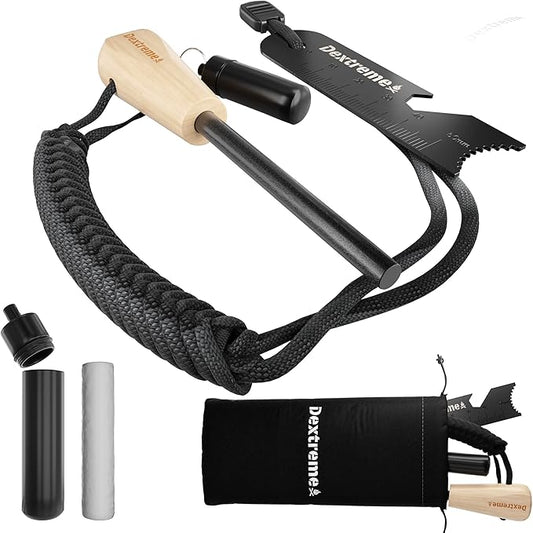 Dextreme Ferro Rod Flint Fire Starter Kit with Handcrafted Wood Handle, Coton Tinder, Transport Bag Multi-Tool Striker Paracord Lanyard for Camping Gear 12,000+ Strikes 5/16'' Thick Bushcraft Survival