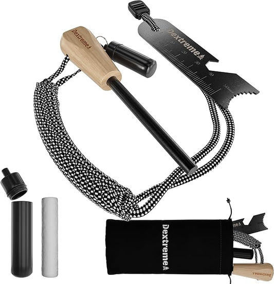 Dextreme Ferro Rod Flint Fire Starter Kit with Handcrafted Wood Handle, Coton Tinder, Transport Bag Multi-Tool Striker Paracord Lanyard for Camping Gear 12,000+ Strikes 5/16'' Thick Bushcraft Survival