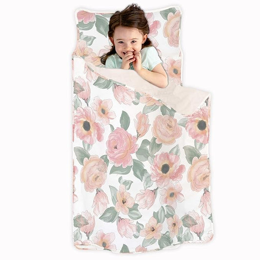 JumpOff Jo - Toddler Nap Mat - Sleeping Bag for Kids with Removable Pillow and Ultra Soft Blanket for Preschool, Daycare, and Sleepovers - Floral Watercolor