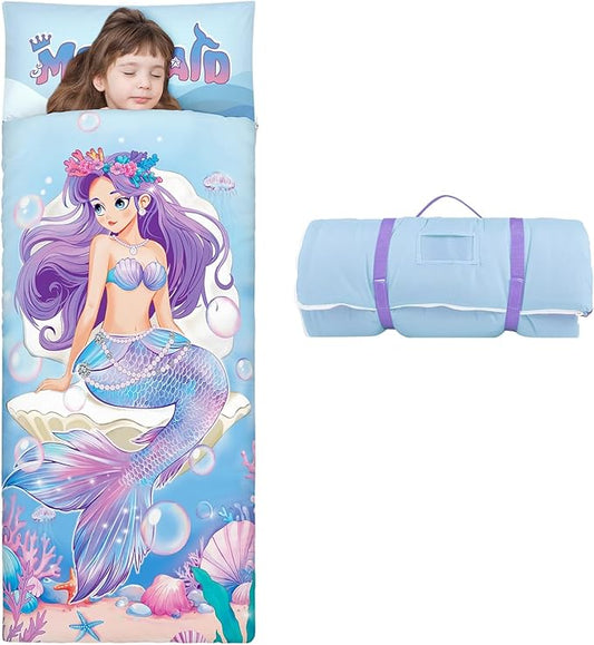 Kids Sleeping Bag Toddler Nap Mat with Removable Pillow, Large Foldable Sleeping Bag for Girls Boys, Easy Clean Slumber Bag with Double Zip for Camping School Preschool Daycare, 59×24 inch