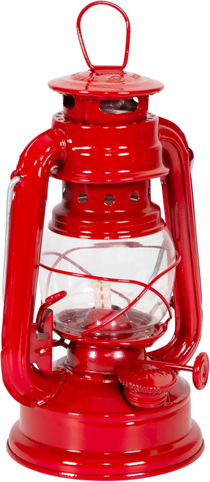 - Classic glass globe lantern with protective wire, metal construction and red finish