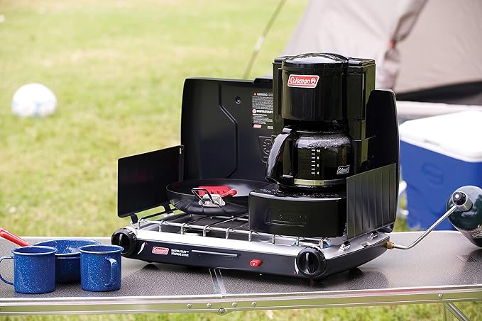 - Camping coffee maker quickly brews up to 10 cups of coffee on a camp stove