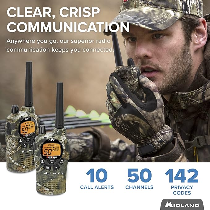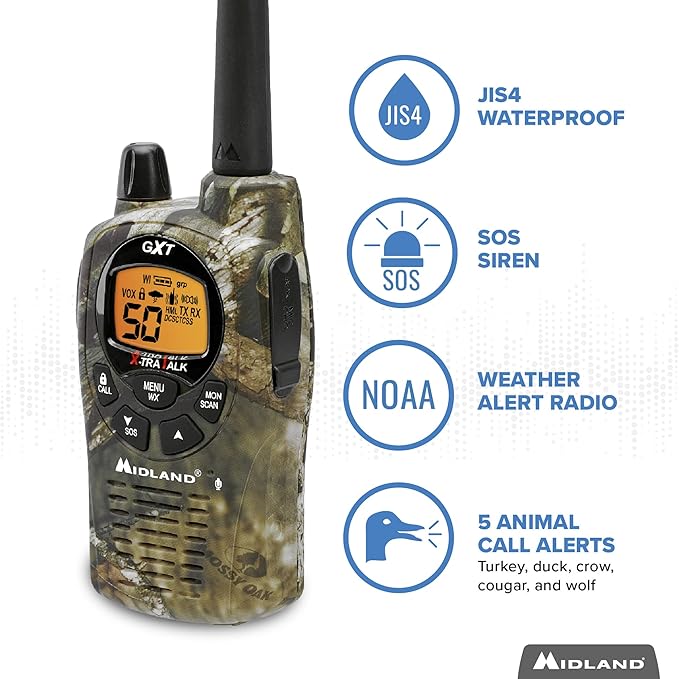 - Features - These walkie-talkies feature 50 GMRS (General Mobile Radio Service) channels, along with a channel scan so you can quickly check for activity. The JIS4 waterproof protection makes these radios splash-resistant, making them ideal for outdoor use. Also comes with 5 Animal Call Alerts (turkey, duck, crow, cougar and wolf), a vibrate feature to silence all tones, and the Mossy Oak Break-Up Country Camouflage pattern make this an ideal walkie-talkie for hunters.