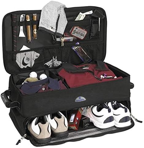 - The Trunk Organizers bottom level holds multiple pairs of shoes with compartment dividers
