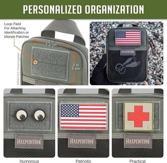 - Front exterior: 2” x 3” loop field for patches; mesh slip pocket with hook-and-loop closure