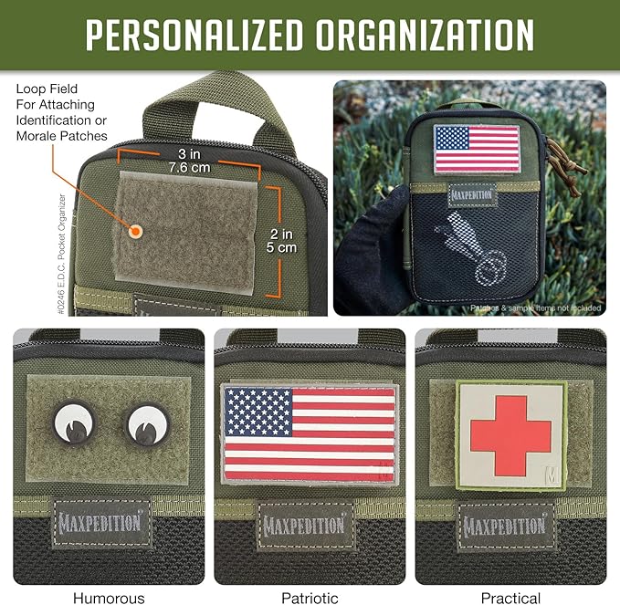 - Front exterior: 2” x 3” loop field for patches; mesh slip pocket with hook-and-loop closure