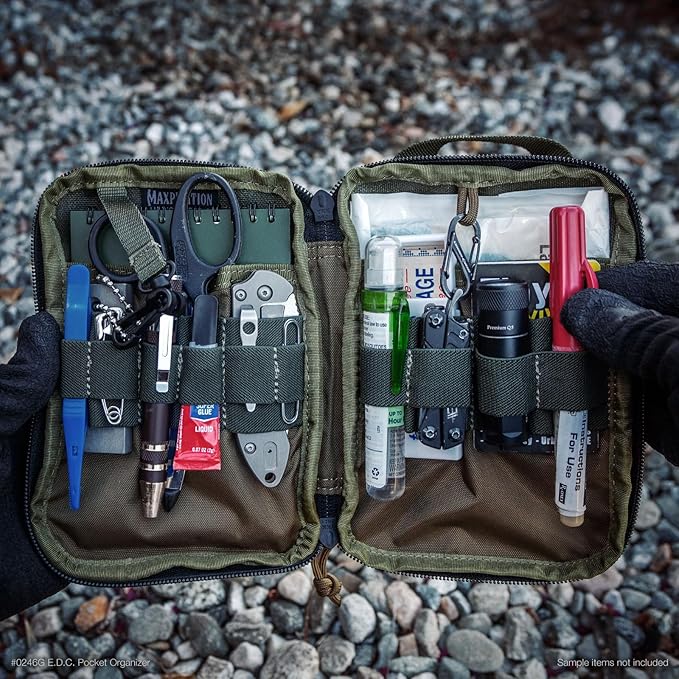 - Inside right: Slip pocket; tie-down loop; elastic organizer with 6 divisions