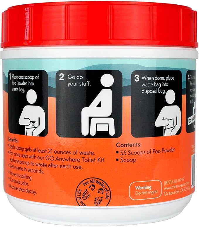 - SAFE; Non-toxic Poo Powder used to extend the uses of the GO anywhere toilet kit