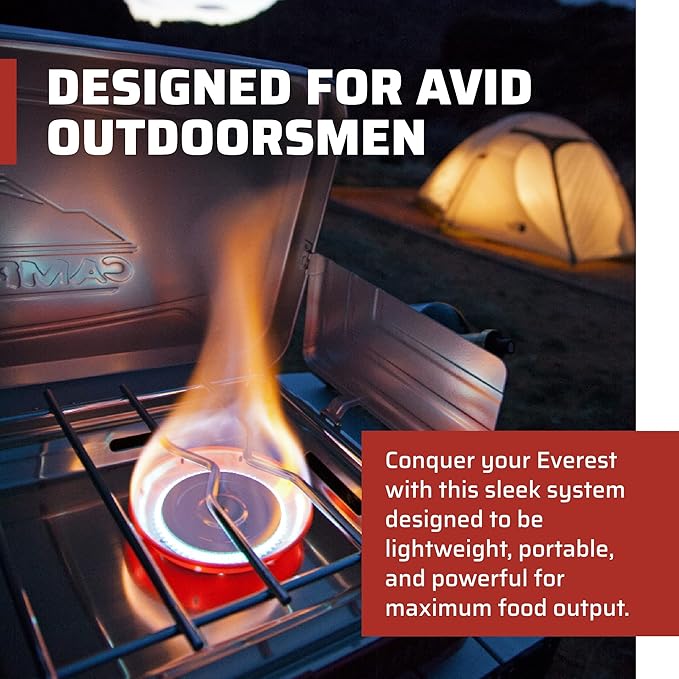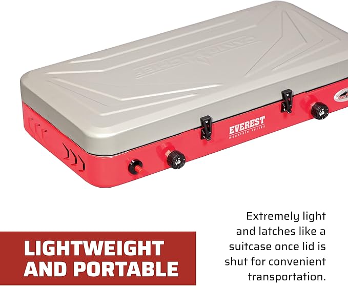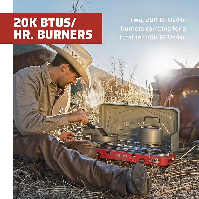 - Powerful Two Burner Stove: Everest's two 20,000 BTU burners are powerful for your cooking needs; lightweight and portable camp stove has a latch lid