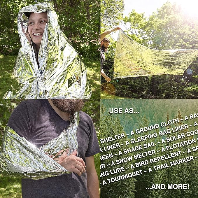 - SURVIVAL VERSATILITY: Uses include bivouac shelter, ground cloth, distress signal, backpack cover, rain poncho, sleeping bag liner, horseshoe pack, wind screen, shade sail, solar cooker, rainwater collector, snow melter, flotation, cordage, fishing lure, bird repellent, splint, sling, bandage, tourniquet, trail marker, bear bag, and more