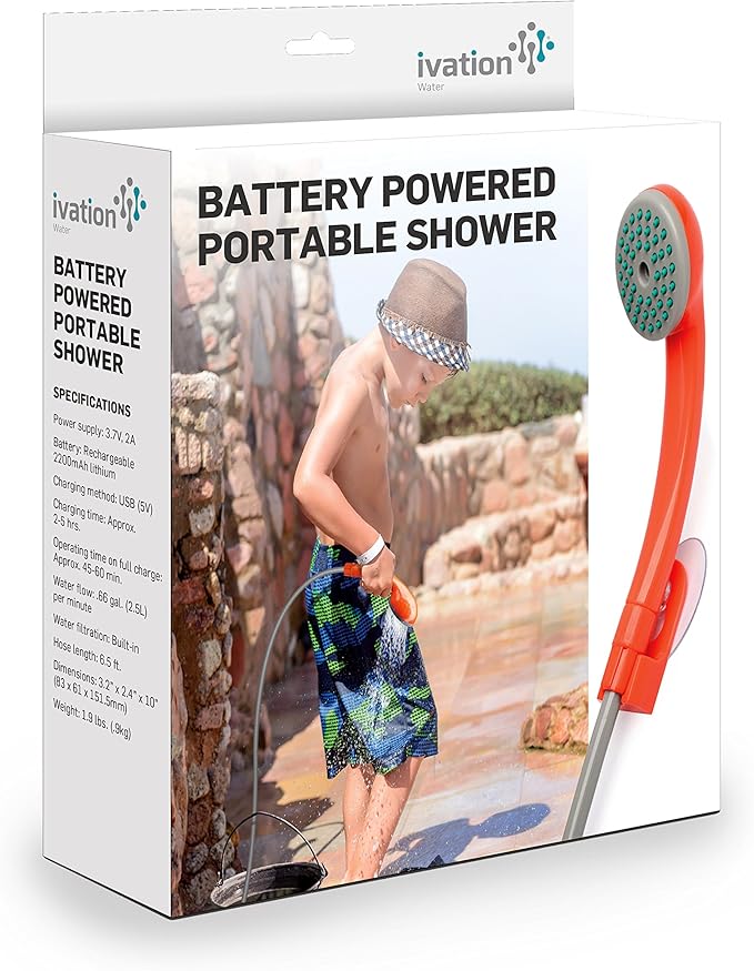 Ivation Portable Outdoor Shower, Battery Powered - Compact Handheld Rechargeable Camping Showerhead - Pumps Water from Bucket Into Steady, Gentle Shower Stream