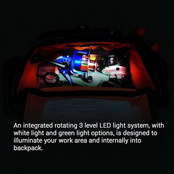 - LIGHTED TOOL BACKPACK: The 3 level LED light system installed in this charging tool backpack allows for fishing from dusk till dawn.
