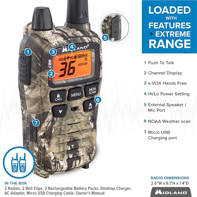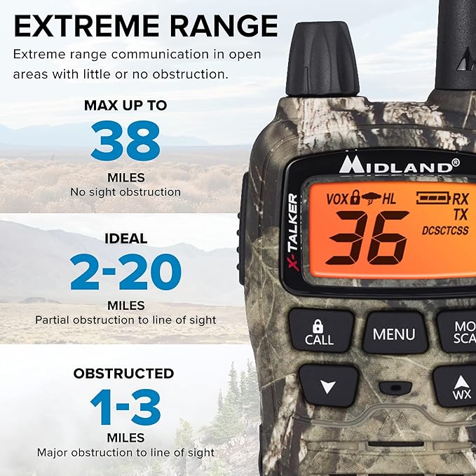 - Ideal for Hunting Adventures: Hunters rejoice! Our walkie-talkies are tailor-made for your needs. With 5 Animal Call Alerts (turkey, duck, crow, cougar, and wolf), you can effortlessly attract game. The Vibrate feature silences all tones, ensuring your stealthy presence. The Mossy Oak Break-Up Country Camouflage pattern further enhances your hunting experience.