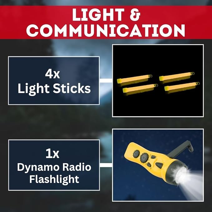 - Included Components : First aid, backpack, shelter, light, water, food, hygiene, tools, water purification