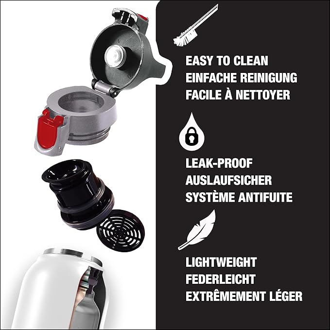 - LEAKPROOF WATER BOTTLES: This insulated water bottle with handle is fully spillproof. Thanks to its ONE lid: Carry, open, drink, close, and repeat only with one hand. Perfect in an urban environment or as a camping water bottle