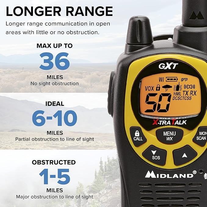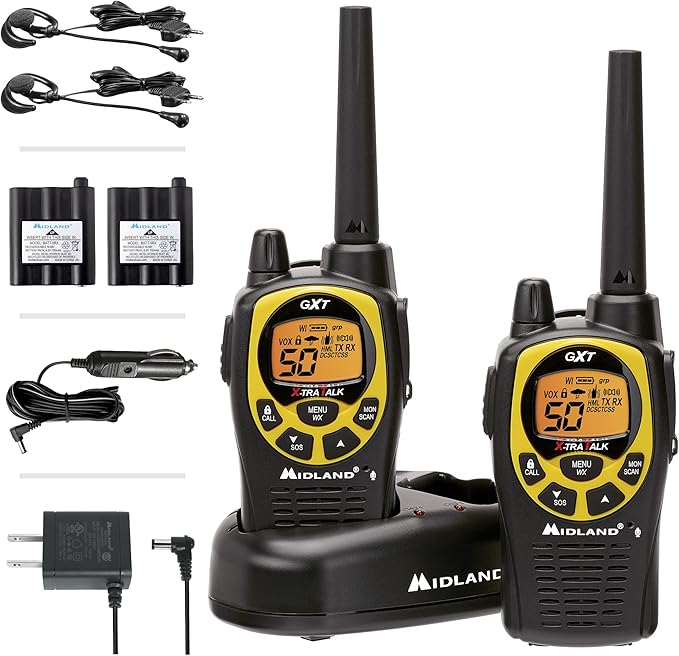 Midland 50 Channel GMRS Two-Way Radio - Long Range Walkie Talkie with 142 Privacy Codes, SOS Siren, and NOAA Weather Alerts and Weather Scan (Black/Yellow, Pair Pack)