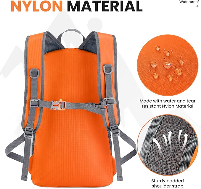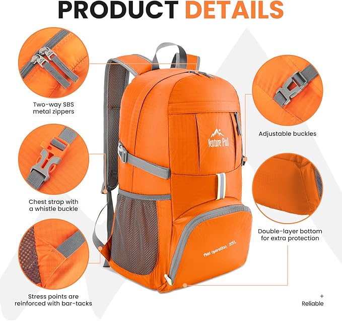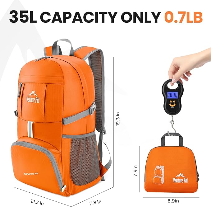 - LIGHTWEIGHT(0.7LB) and ROOMY(35Liters). Fold the backpack into its own pocket and unfold it when you reach your destination. To avoid overweight charge, simply unfold from your checked bags and use it as a carry on for your excess baggage.
