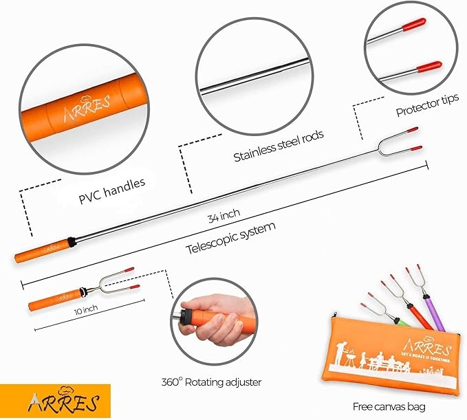 - Smart Design: We’ve taken great care in making our roast em telescoping marshmallow roasting sticks for fire pit Perfect! Our hot dog roasting sticks for campfire or marshmallow sticks are extendable to 34” and roast your goodies from a distance. Fast and Easily. Even more, every roasting sticks for camp fire comes with safety pins to make the campfire sticks safe for storage and handling around children..