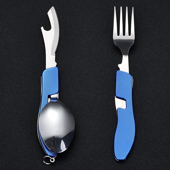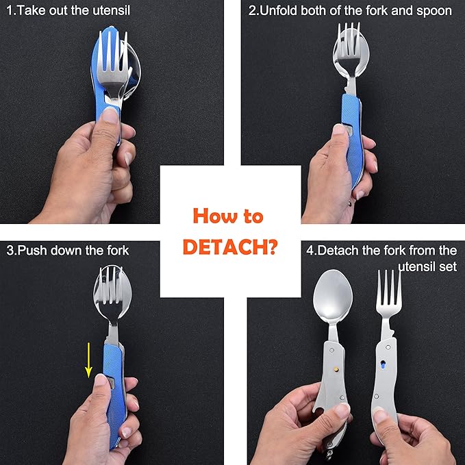 - ✓4-𝐈𝐍-1 𝐂𝐀𝐌𝐏𝐈𝐍𝐆 𝐔𝐓𝐄𝐍𝐒𝐈𝐋 𝐈𝐍 𝐘𝐎𝐔𝐑 𝐏𝐎𝐂𝐊𝐄𝐓: Looking for a light, compact but fully portable camping utensils? You just found it! Equipped with a detachable fork, spoon, knife and bottle opener set, our camping cutlery set is easy to store in your pocket or pack so you’ll always be prepared - the perfect companion on the go.