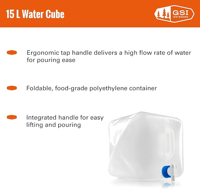 - Collapsible 15-liter water container for storing and serving water that's great for hydrating, cooking, and cleaning while camping and backpacking
