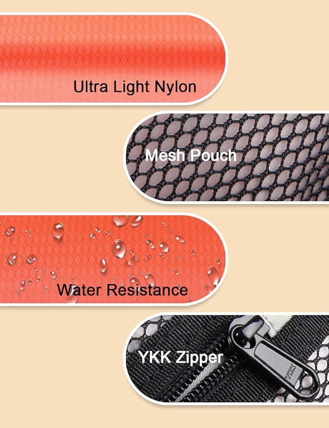 - LOTS OF POCKETS: In order to make things well organized, we designed of lots pockets for partition articles. Main compartment is large enough for bottles. In one side, a center pouch opens with a webbed waterproof zipper pouch. And in another side has been divided into 2 elastic mesh pouches. Also there is one zipper pouch for keeping small items outside in back of the pouch.