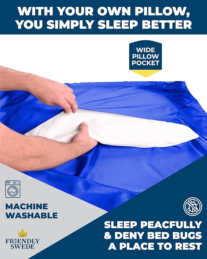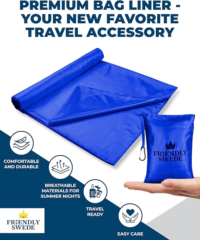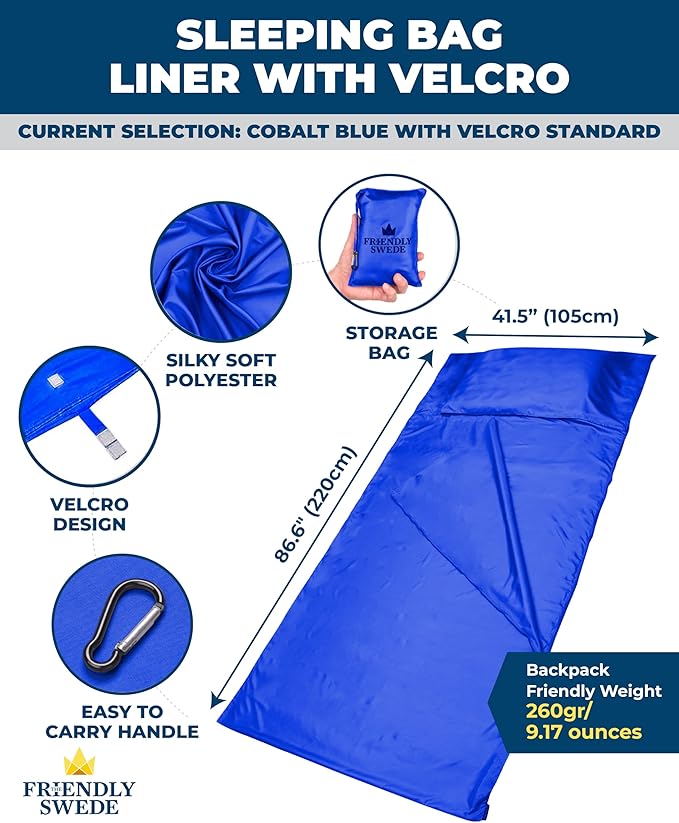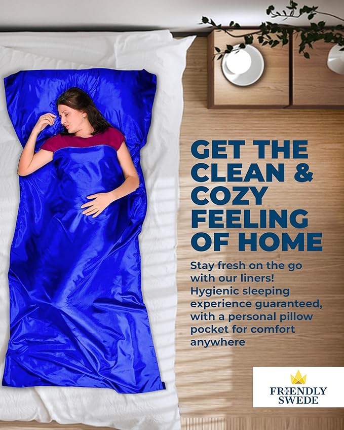 The Friendly Swede Sleeping Bag Liner Ultralight - Thin Travel Sheets for Hotel; Silky Feel Camping Sheets & Adult Sleep Sack for Backpacking and Hiking; Travel Sleeping Bag - Blue (Velcro)