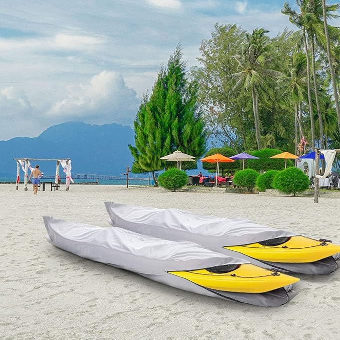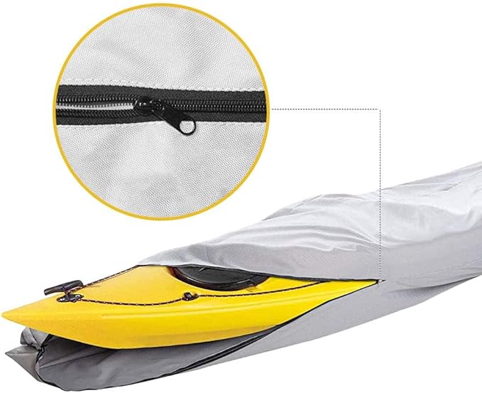 - Heavy-Duty Fabric and Reinforced Sewing Stitches: Made with 600 Denier marine grade waterproof fabric, which is tough and long-lasting. All-weather protection, easy to clean. For optimal waterproofing, store your kayak on its side or bottom up with the zipper on the bottom to avoid water entering through the zipper. All seams feature reinforced stitches for durability (Note: Place the zipper at the bottom to prevent water from entering)