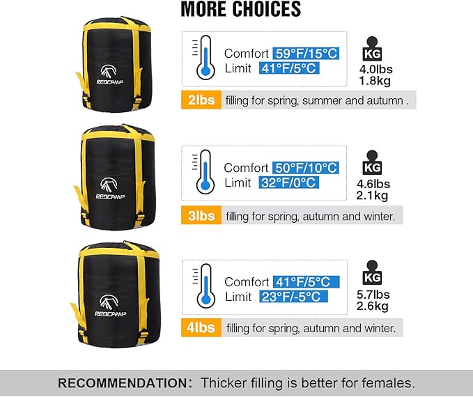 - Temperature Range: 3lbs filling 80% cotton lined adult sleeping bag is comfort in 50°F/10°C and fits temperature range 41-68°F/5-15°C. 4lbs filling sleeping bags is comfort in 41°F/5°C, and fits temperature range in 32-59°F/0-15°C. Females are recommended to choose the thicker sleeping bags.
