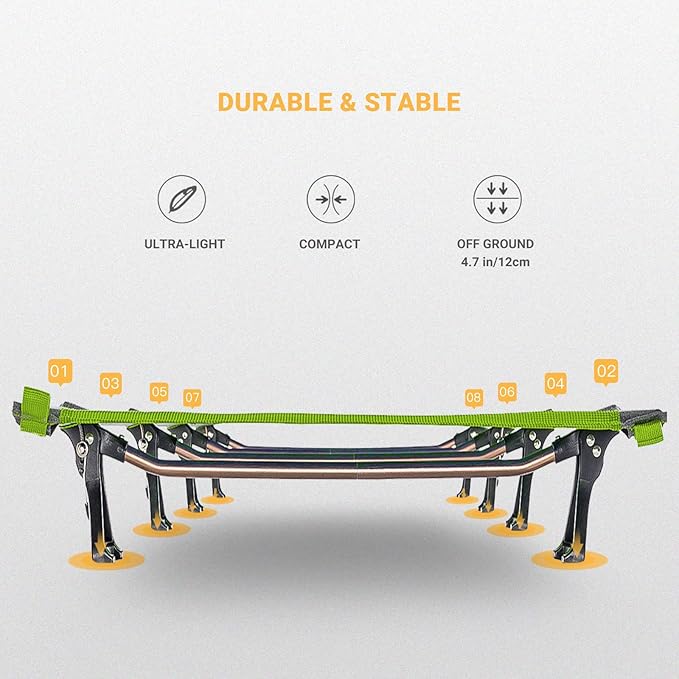 - ★【Ultralight & Portable】 Only 4. 9 lbs and packed Size: 14 × 5. 1 × 5. 1 inches, this camping cot is highly portable and space-saving! Wherever your adventure is, this smart light camp-cot can be stored in your backpack.