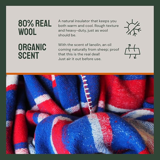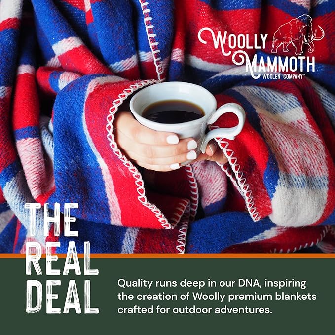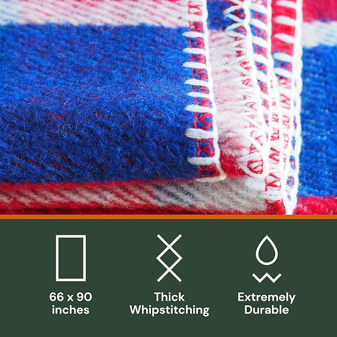 Woolly Mammoth Merino Wool Blanket- 66" x 90" 4 lbs Thick, Outdoor/Indoor Throw for Campfire, Picnic, Beach, Van Life, Home- Farmhouse Collection Heavy Duty Insulating Sleep Plaid, Red White & Blue