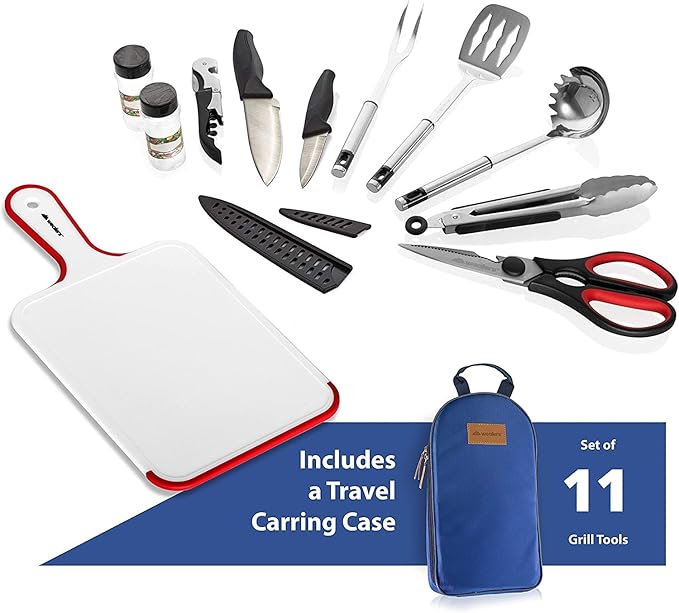 - MULTIPURPOSE: The trendy kit can be used for multiple applications, perfect for concerts, sporting events, hiking, boat rides, mountaineering and BBQ’s. The weather retardant the travel utensil kit is the perfect camp kitchen accessory, and it holds all your essential outdoor cooking utensils.