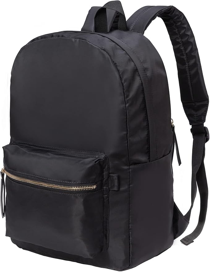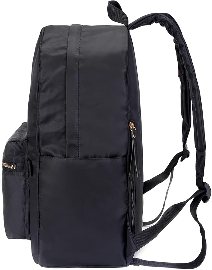- Side pockets for water bottle. Spacious main pocket, gold zipper front pocket, enough space to carry on your school supplies, clothes, umbrella, notebooks, A4 folder, and most 14"laptop ( some ultra-slim 15.6 inch MacBook)