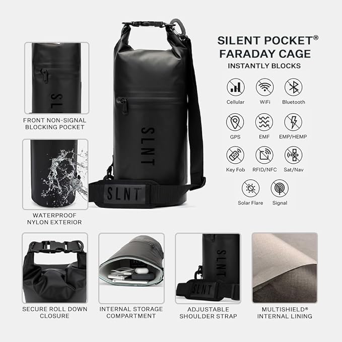 Silent Pocket SLNT Waterproof Faraday Dry Bag Military-Grade Nylon 10 Liter Faraday Bag - RFID Signal Blocking Dry Bag/Waterproof Backpack Protects Electronics from Water, Spying, Hacking