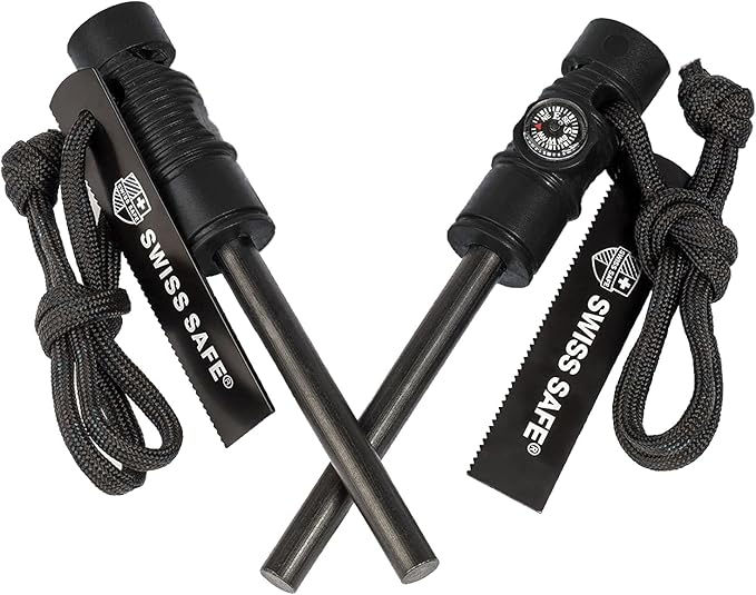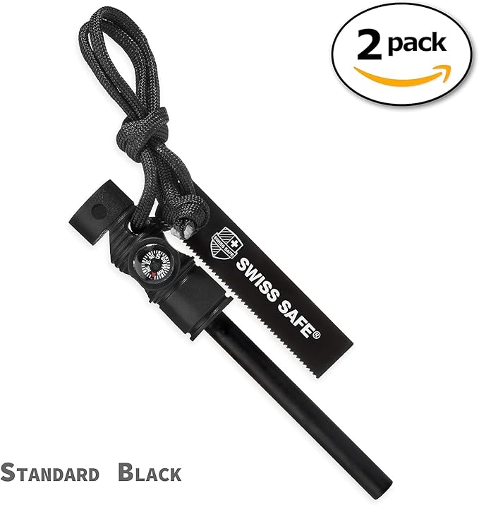 Swiss Safe 5-in-1 Fire Starter with Compass, Paracord and Whistle (2-Pack) for Emergency Survival Kits, Camping, Hiking, All-Weather Magnesium Ferro Rod