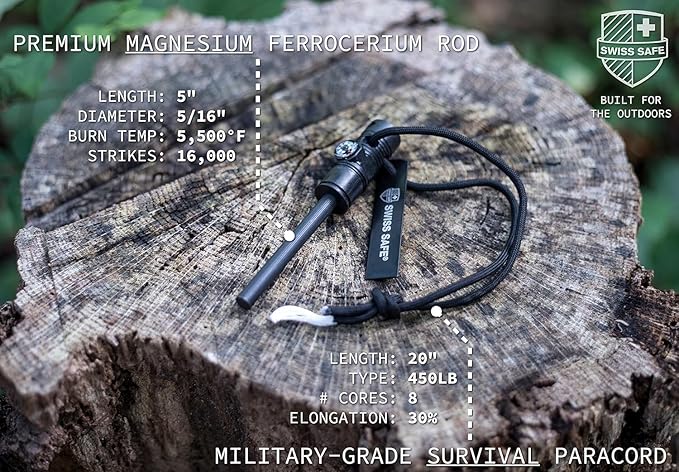 - All-in-One Survival Tool: Beyond its primary fire-starting feature, it incorporates a precision compass for navigation, a 150dB whistle for emergency signaling, a robust steel scraper, and a 450 LB 8-core paracord for any situation & rod.