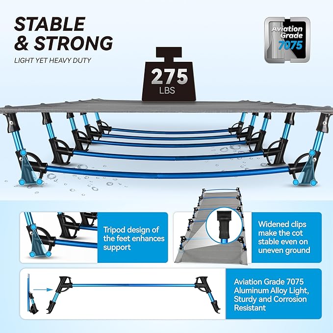 - Comfort: Cot size is optimal for most people, your arms can stay in the bed without crowded feeling. 5 heavy duty rods strongly support the cot make cot surface flat without sag. 10 anti-skid feet make the bed stable without wobbling. Off ground design keeps you away from hard and wet ground.