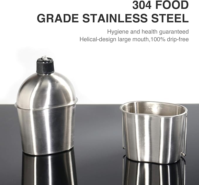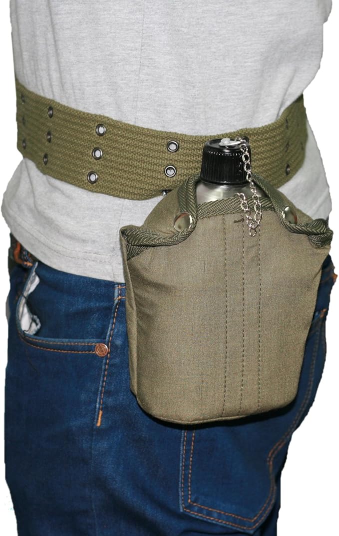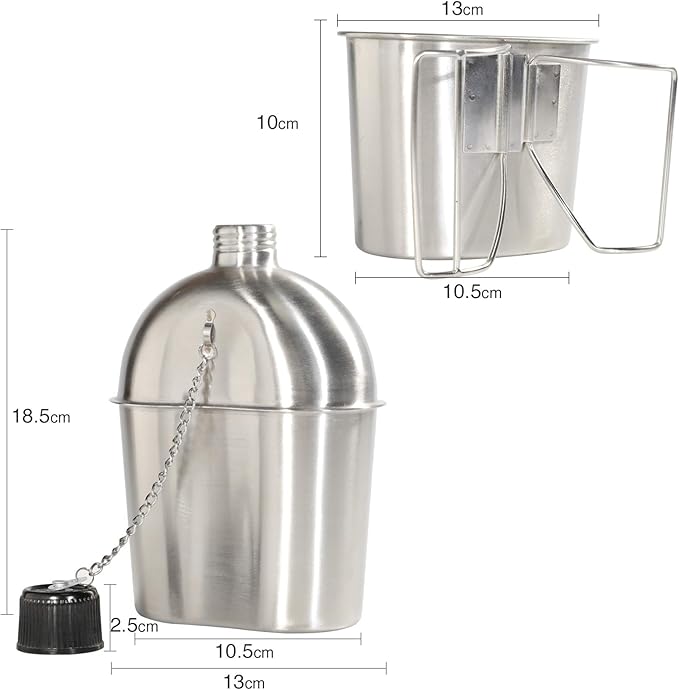 - CUP AND BELT INCLUDED: A stainless steel cup with a foldable handle fits snugly along the bottom of the metal canteen. This canteen cup can be used to collect water and can directly be set on a fire to boil water or cook meals. The belt that's included is the optimal device for connecting the canteen to yourself or another object.