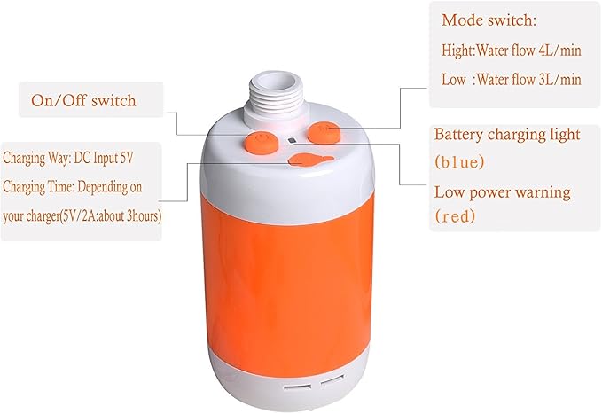 - [Charging Convenient and Safe]:The Portable Electric Shower equipped with battery charge and discharge protection circuit, Use 5v USB charging. And equipped charging indicator light.