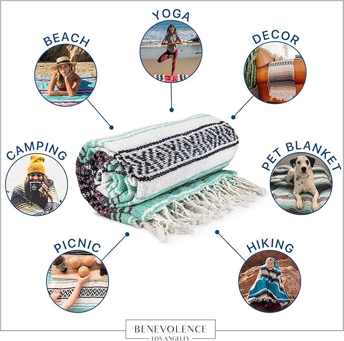 Benevolence LA Authentic Handwoven Mexican Blanket, Yoga Blanket - Perfect Outdoor Picnic Blanket, Beach Blanket, Camping Blanket, Equestrian Saddle Blanket, Serape Blanket 50x70 inches - 1 Blanket