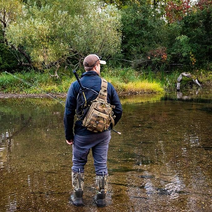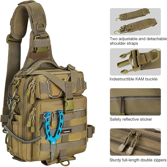 - Adjustable & Detachable Strap: Two left/right exchangeable, adjustable, and detachable shoulder straps make it easy to use this bag as a sling shoulder bag, backpack, handbag, chest bag, fishing tackle bag, or traveling bag. With two rod belts to hold your rods, the main strap length can be extended up to 51.2'', while the associate strap can be extended to 36.2''