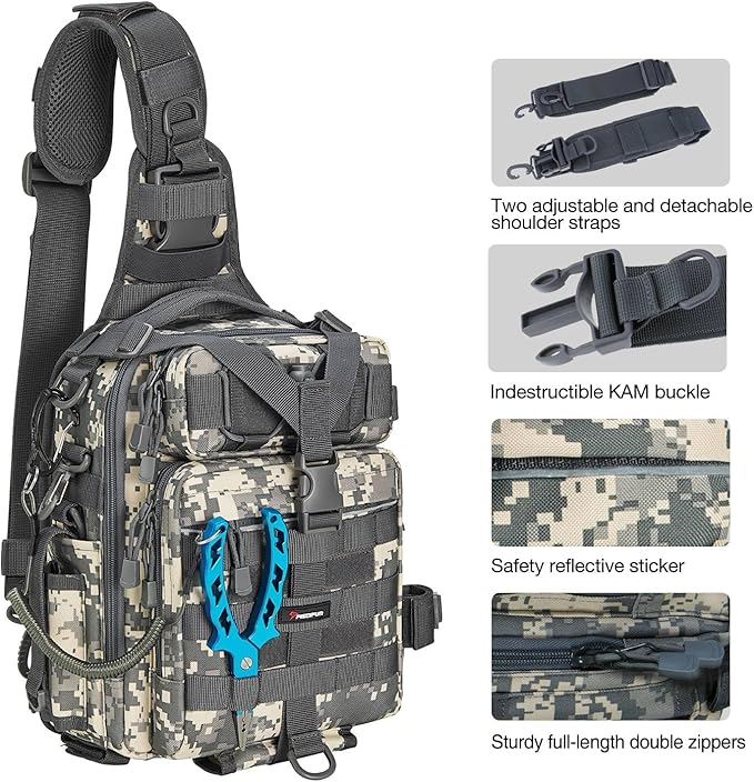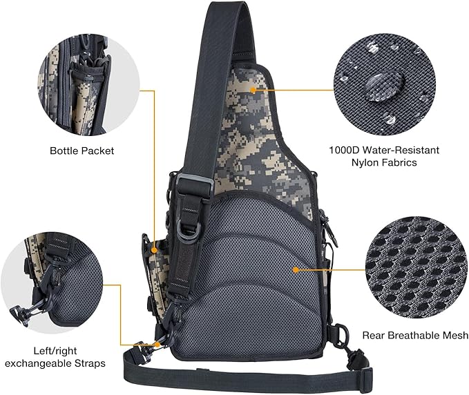 - Adjustable & Detachable Strap: Two left/right exchangeable, adjustable, and detachable shoulder straps make it easy to use this bag as a sling shoulder bag, backpack, handbag, chest bag, fishing tackle bag, or traveling bag. With two rod belts to hold your rods, the main strap length can be extended up to 51.2'', while the associate strap can be extended to 36.2''