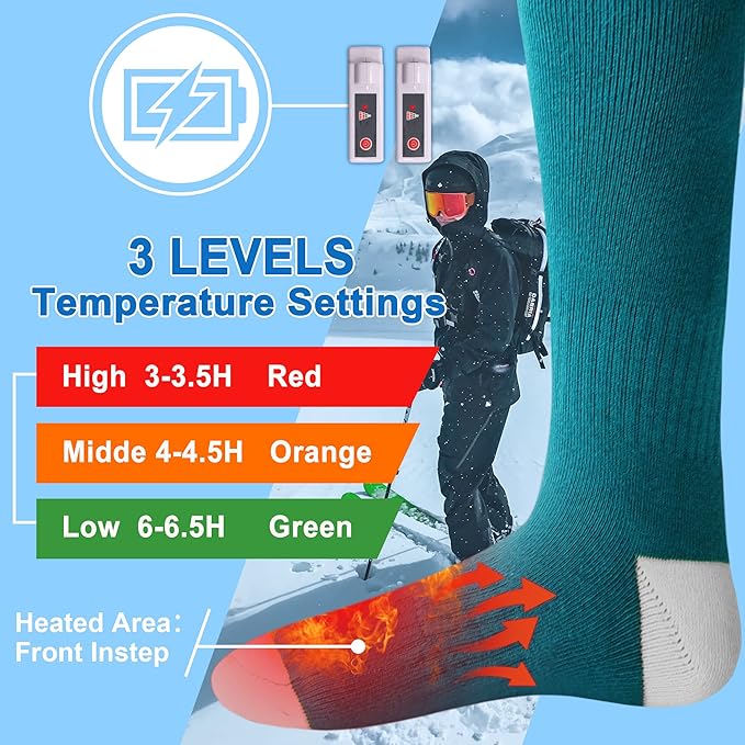 - 【𝐀𝐮𝐭𝐨𝐜𝐚𝐬𝐭𝐥𝐞 𝟑.𝟕𝐕 𝐌𝐞𝐧 𝐖𝐨𝐦𝐞𝐧 𝐁𝐚𝐭𝐭𝐞𝐫𝐲 𝐇𝐞𝐚𝐭𝐞𝐝 𝐒𝐨𝐱 𝐊𝐢𝐭】Designed with 3 Heating Systems,Autocastle 3.7V Winter Warm Rechargeable Battery Heated Stockings Can Meet Various Needs.Autocastle 3.7V Unisex Rechargeable Heated Socks with Highest Temperature Ups to 122°F.Highly Recommend to Turn on Autocastle Heated Socks at Highest Setting(Red Light) in the First 5-15 Minutes,Then Switch to Medium (Orange Light)or Lowest(Green Light)Settings,Thus Will Be Better.