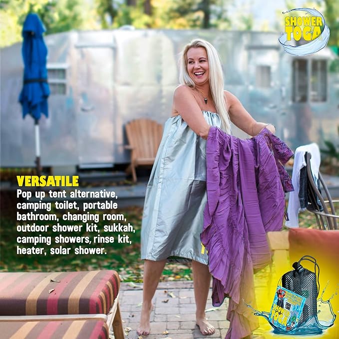 - Portable and Versatile - The Shower Toga is not just a wearable shower garment, but also serves as a privacy RV & and camping shower, surf poncho, shower tent, and portable changing room. It is designed to provide privacy and convenience during your outdoor adventures, whether you are camping, surfing, or swimming at the pool.