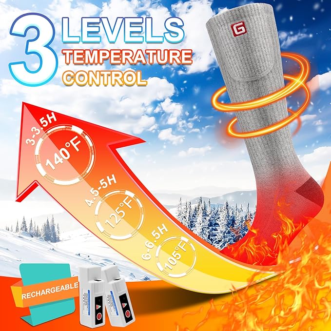 - 🔥Long Lasting Time: Soft heated socks equipped with 2pcs rechargeable Li-ion batteries with over voltage protection. Keep you warm and comfortable all day (especially for chronically cold feet), heat temperature up to 130°F, perfect for outdoor sports and work