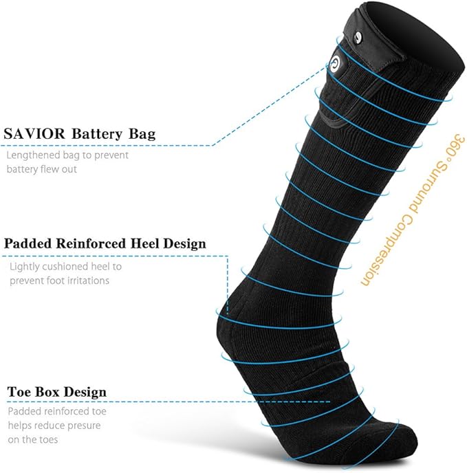 - 【Various Size Option】Savior Heated socks are design for all Men, Women, Male, Female, Boys, Girls and Elders to keep your feet warm. unlike other brands' designs with One size fit all heated socks, We provide S, M, L, XL size options, you can choose your snug-fit heated ski socks according to the size chart shown in the picture