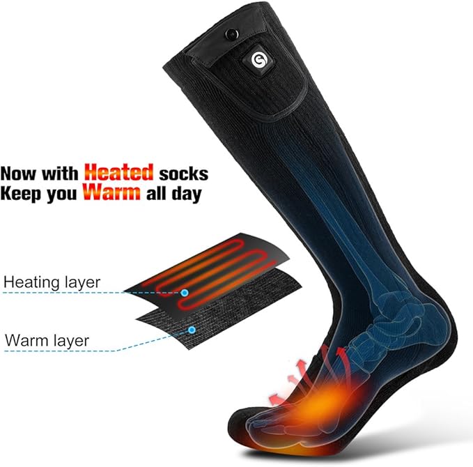 - 【Suitable for Winter Outdoors】Over the calf heated warmer socks are friendly with your ski boots; Coolmax, elastic, and Spandex material provides premium insulation performance while being midweight thickness and soft; the battery heated long socks are perfect for hunting, camping, skiing, skating, snowboarding, fishing, hiking, walking dogs, motorcycle, riding, office or outdoor working, etc.