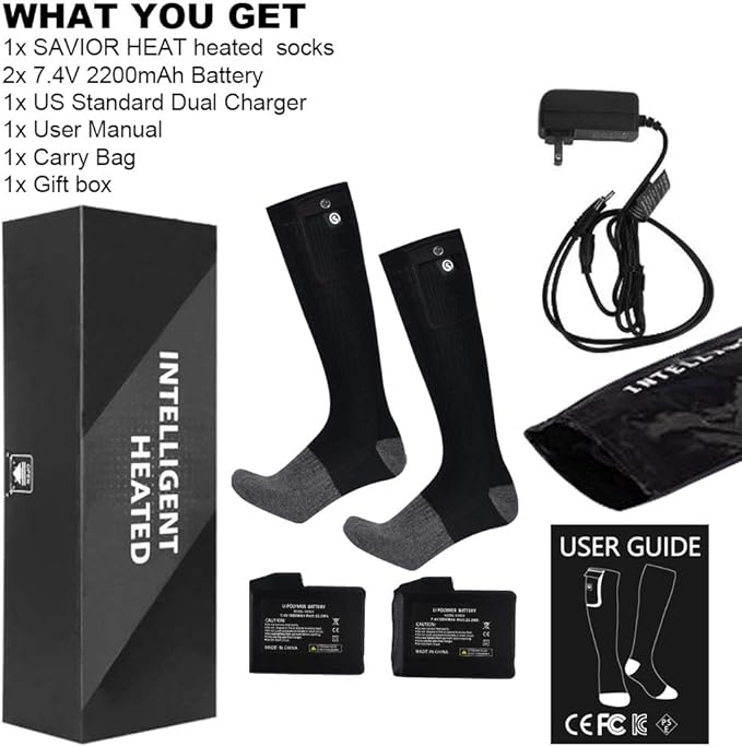 - 【Upgraded Heated Socks】SAVIOR heated socks improving 10% the softness of electric wires, to make sure you can feel more comfortable wearing experience; The non-slip elastic prevents slipping but does not restraint your leg; Battery pocket with cover is much easier to install batteries than others' with zippers or buttons; Come with USB-DC Charger and 2 pcs 7.4v 2200mah rechargeable batteries allow you to charge them at the same time, about 4-5 hours for a full charge