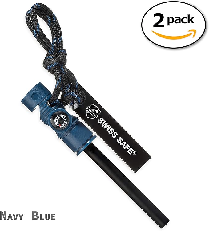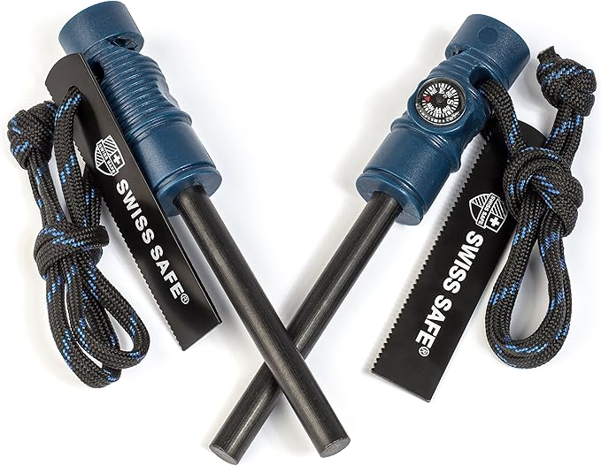 Swiss Safe 5-in-1 Fire Starter with Compass, Paracord and Whistle (2-Pack) for Emergency Survival Kits, Camping, Hiking, All-Weather Magnesium Ferro Rod
